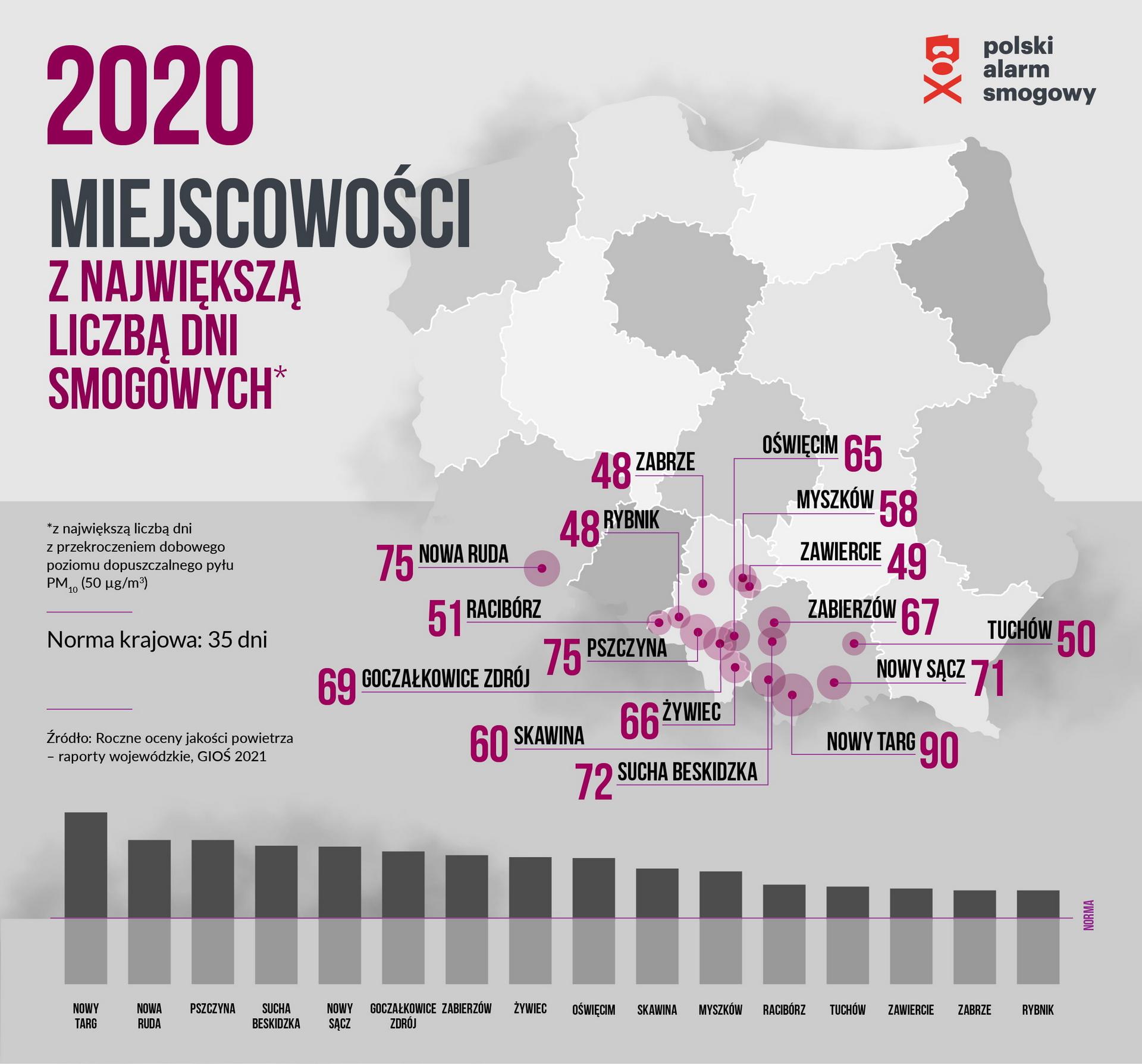 Najnowsze pomiary, które jak co roku publikuje Częstochowski Alarm Smogowy wskazują na znaczne zwiększenie poziomu toksycznego smogu w powiecie zawierciańskim. Na podstawie danych ze stacji w Zawierciu w powiecie zawierciańskim wykryto liczne przekroczenia norm dla smogu (PM 10). Polski Alarm Smogowy stworzył Ranking Miejscowości z największą ilością Smogu w 2020 roku. Niestety Zawiercie również znajduje w tym rankingu. Według Polskiego Alarmu (GIOŚ 2021) było 49 dni smogowych z przekroczeniem normy stężeń dla PM 10, która wynosi 50 µg/m³. W 2021 roku Częstochowski Alarm Smogowy rozpoczął realizację projektu #JurabezSmogu, którego efektem jest interaktywna mapa, natomiast w 2022 opracowane grafiki i wykresy powstały na podstawie oficjalnych wyników i pomiarów ze stacji Państwowego Monitoringu Środowiska (PMŚ Zawiercie, ul. K.I. Gałczyńskiego 3). Co istotne, analiza dotyczy najnowszych danych z regionu, w których prowadzone są pomiary PMŚ. Nie jest znana sytuacja w pozostałych gminach powiatu zawierciańskiego, lecz można przypuszczać, że również i tam jakość powietrza często znacząco odbiega od obowiązujących norm.